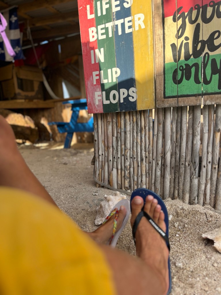 Für den letzten Abend schickten wir uns an, in der berühmten, seit einem halben Jahrhundert bestehenden Bar eine Cocktail zu schlürfen, heimlich Mick Jagger auflauernd natürlich. Da wir den Strand nicht wie echte Abenteurer erreichen konnten, entschlossen wir uns, vor den Cocktails noch einen Spaziergang dorthin zu machen, so wie es die Landratten – Touristen zu tun pflegten. Als wir an der am Dinghydock angebrachten Leiter hochkletterten, waren wir plötzlich in einen surrende Wolke eingehüllt. Manu wurde sofort von kleinen bissigen Fliegen attackiert, worauf wir fluchtartig das Dock Richtung Strand verließen. Doch auch diese kleinen Biester, glücklich und motiviert eine lohnende Beute gefunden zu haben, taten es uns gleich. sie begleiteten uns an den Strand, und alle Versuche sie loszuwerden schlugen fehl. Es handelte sich um „Sandflies“ Sandflöhe. Ich glaube, wenn man diese Tierchen unter dem Mikroskop vergrößert, sieht man eine Gebiss mit Flügeln. Dennoch schossen wir traumhafte Bilder und lenkten unseren Schritt im Lichte der untergehende Sonne in die berühmte Bar. Wir nahmen auf der Terrasse platz, immer noch eingehüllt von diesen lästigen Plagegeistern. Ich fragte unseren Ober, ob er denn eine Idee hätte, worauf dieser mit einem gezielten Handgriff eine Spraydose zum Vorschein brachte. Wir waren wohl nicht die ersten Gäste mit diesem Problem. Schnell waren Manu und ich in eine Wolke einer Chemikalie eingehüllt, welche sofort ihre Wirkung entfaltete. Wir wollten gar nicht so genau wissen, was wir da gerade versprüht hatten, doch das Ergebnis war beeindruckend, sogleich war es vorbei mit dem Jucken.