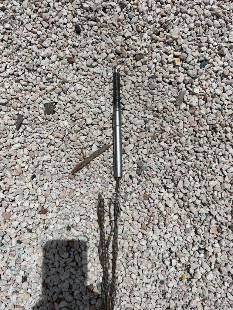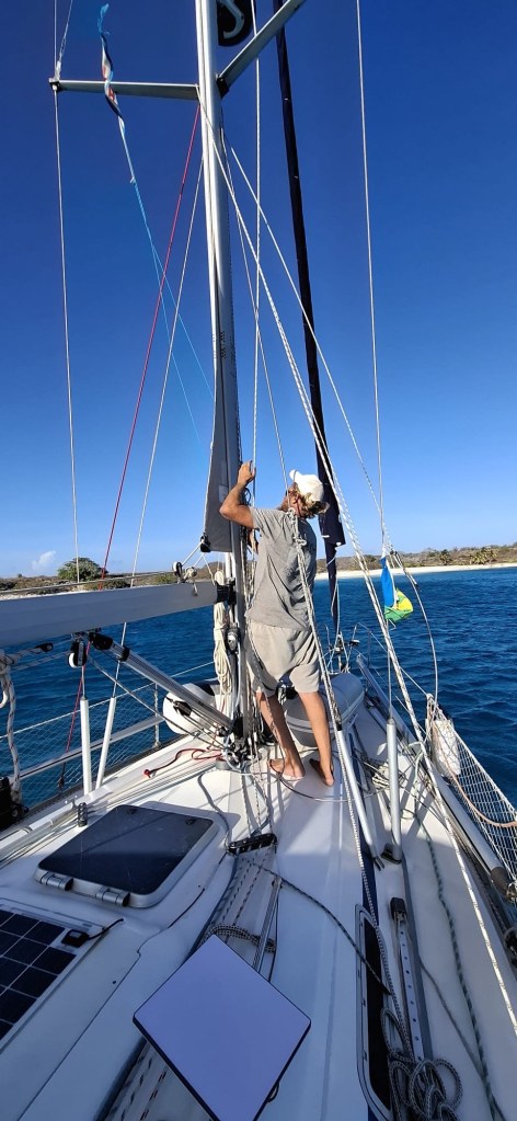 Nach mehreren Veruchen gelang es mir ein Seil um die, der gebrochenen Want gegenüberliegenden Maststrebe (Saling) zu werfen und diese so zu verspannen, dass der Mast sein wildes Geschaukel beendete. In ruhiger See hätte das wohl genügt, doch die vereinzelt kommende, relativ hohe Dünung, veranlaßte den Mast weiterhin bedrohlich zu wanken. Es war Zeit für einen reiflich überlegten Plan gekommen. Wir besprachen, was zu tun sei und gingen ans Werk. Während ich die entsprechenden Arbeiten ausführte, steuerte Manuela die Inspiration sanft durch die Wellen. Derweil schaffte ich mittels dem verbliebenen Rest der Want, Seilklemmen, einem Festmacherseil und einer Umlenkrolle ein Konstruktion, die es uns erlaubte die gebrochene Want mittels der Genuawinch im Cockpit so fest anzuziehen, dass der Mast so gut wie möglich gesichert war. Es wurde Gott sei Dank schon hell, ein wahrer Segen für die Arbeiten auf dem Mittelschiff. Trotz der hervorragenden Steuerleistung von Manu, wankte des Schiff unter den Wellen ordentlich hin und her. Ich war natürlich gesichert, musste mich trotzdem am Mast festhalten, während ich die Seilklemmen anbrachte. Dies hatte zur Folge, dass ich kurz vor Ende der Operation meine Ratsche samt Verlängerung und 13er Nuss in den Tiefen des karibischen Meeres versenkte.
