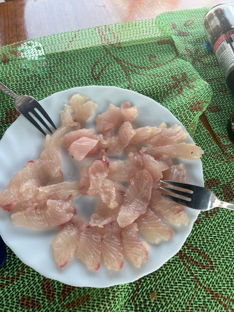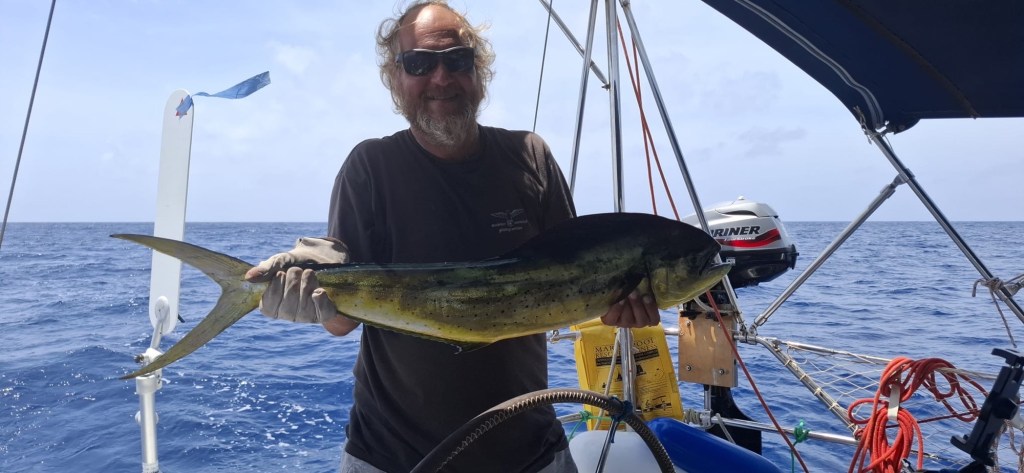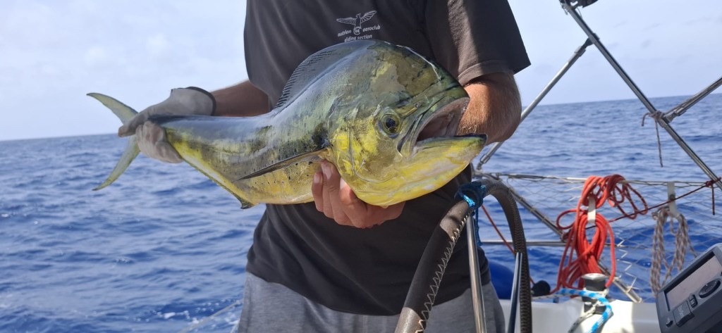 Auf so einer Reise geht es nicht nur in der Welle auf und ab. Am nächsten Tag versuchten wir unser Glück wieder mit der Angel und es sollte nicht lange dauern, bis das vertraute Surren der Angelschnur zu vernehmen war. Diesmal surrte die Angel nicht, sie schrie förmlich aus: „Da hängt was Wuchtiges dran“, und der nun folgende Drill hatte etwas von einem Wettkampf. Der Fisch rang um seine Freiheit, ging hin und her, zuweilen auf Tiefe. Die Spitze der Angelroute bog sich derart, dass wir fürchten mussten, sie würde jeden Moment in tausend Teile bersten. Doch Alex hat uns Profimaterial überlassen. Die Rute hielt Stand, Umdrehung um Umdrehung, zog den Fisch näher an die Inspiration heran. Noch hatten wir keine Idee um was es sich handeln würde, denn der Fisch hatte sich nur kurz bei einem Sprung aus dem Wasser gezeigt. Während ich den Fisch ermüdete (oder er mich?) wetzte Manuela schon die Filetiermesser. Eine kurze Weile später lag der Fisch an Deck, ein kapitaler Mahi Mahi, der standesgemäß mit prämiertem Tequilla betäubt und anschließend sofort erlöst wurde. Manuela schwang meisterhaft die Klingen, bald waren Innereien und Kopf über Bord und leckeres, frisches Sushi am Teller. Den „Rest“ des Fisches verzehrten wir Abends und die nächsten Tage genüßlich in Form von Filets. Herrlich.