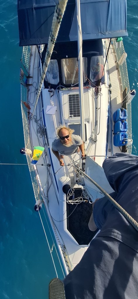 Als wir der Insel näher kamen, funkten wir den lokalen Küstenwache Stützpunkt immer wieder an. Doch es blieb still im Äther. Schließlich umrundeten wir das Kap der Insel und endlich erreichten wir ruhiges Wasser. Da die Wellen die Hauptursache für unsere Befürchtungen bezüglich den Mastes waren, konnten wir endlich durchatmen, auch wenn der Wind noch kräftig bließ. Eine Stunde später lag die Inspiration sicher verankert in der Westbucht der Insel. Manu wurde sofort in den nochmals zusätzlich gesicherten Mast gezogen und tauschte die Want aus. Wir spanten die neue Want entsprechend der Anderen und freuten uns auf Sundowner, Abendessen und Bettruhe.