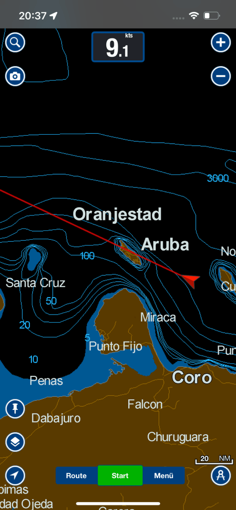 Flott ging es dahin, der Wind blies mit15 bis 20 Knoten dahin und eine Strömung fast genau auf unserem Kurs tat das ihrige zu unserem flinken Fortkommen. Die Geschwindigkeitsanzeige stieg stetig, um zeitweise lichte Höhen von 9 kn zu erreichen, dass ist für ein 10,5 Meterboot schon sehr beachtlich. So ging es in rauschender Fahrt in die Nacht hinein. Wir verkleinerten die Segelfläche, wie wir es immer für die Nacht taten, doch wurden wir nur unmerklich langsamer, da der Wind unser Reff zum Anlaß nahm weiter aufzubrisen. So durchquerten wir die Wasser zwischen Curacao und Aruba im wahrsten Sinne des Wortes in „Windes Eile“. Nachts war es immer etwas surreal, mit so hohen Geschwindigkeiten zu segeln, denn der Mangel an Sicht lässt die Bootsgeschwindigkeit noch höher erscheinen. Zeitweise kam uns so der „fliegende Holländer“ in den Sinn.