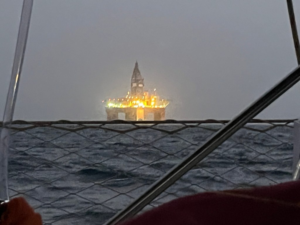Normalerweise freut sich ein Segler über eine schnelle Fahrt und auch wir taten dies, bis wir bemerkten, dass wir viel zu bald in Aruba ankamen. Früher als erwartet, noch mitten in der Nacht erblickten wir die Lichter der Insel. Ein Blick auf die Seekarte verriet uns, dass es keine gute Idee war, Aruba bei Nacht anzusteuern, waren die Einfahrten in die Ankerplätze doch von Riffen und Untiefen gesäumt. Da die Uhr erst drei Uhr morgens zeigte, mussten wir Wohl oder Übel die Zeit bis zur Öffnung der Behörden hier draußen im Ankerfeld der großen Pötte absitzen. Bei Wachübernahme wies mich Manu auf ein vermeintlich großes Schiff, wohl ein Tanker, hin, dass einige Meilen vor uns vor Anker zu liegen schien. Während Manu sich im unter Deck zur Ruhe bettete, übernahm ich das Steuer und segelte die Inspiration auf dieses Ungetüm zu, denn in dessen Nähe würden wir auf den Morgen warten. Das Radarsignal war irgendwie schwierig zu deuten, machte es doch gar nicht das, was Schiffe normalerweise tun. So beschloss ich, einfach Sichtkontakt zu halten, war ich mir doch nicht mehr sicher, ob dieser Riese vor Anker war oder in langsamer Fahrt dahintuckerte. Auch das AIS trug nichts zur Klärung der Situation bei. Eine gute Stunde später waren wir dem USO (Unbekanntes Schwimm Objekt) erheblich näher gekommen, doch machte die Silhouette des USO die Situation auch nicht einfacher. Ich hatte noch nie ein so eigenartiges „Schiff“ gesehen. Der morgendliche Dunst im fahlen Dämmerlicht kam erschwerend dazu. Schließlich entschied ich mich unseren Kurs um 60 Grad zu ändern. Die Seitenansicht des USO ließ es mir wie Schuppen von den Augen fallen. Das „Rießending“ war weder eine Tanker noch ein Alienraumschiff, es war schlicht und ergreifend eine mächtige Bohrinsel. Überrascht und erleichtert begannen wir , in der Nähe dieses Ungetüms langsam unsere Kreise zu ziehen. Mittlerweile war Manuela aufgewacht und ebenso verwundert wie ich über diesen seltsamen „Verkehr“. Wenige Minuten später war die Inspiration vom wunderbaren Duft frischen Kaffees erfüllt. Die Sonne stieg langsam über den Horizont und wir konnten unser Fahrt auf Aruba zu fortsetzten.