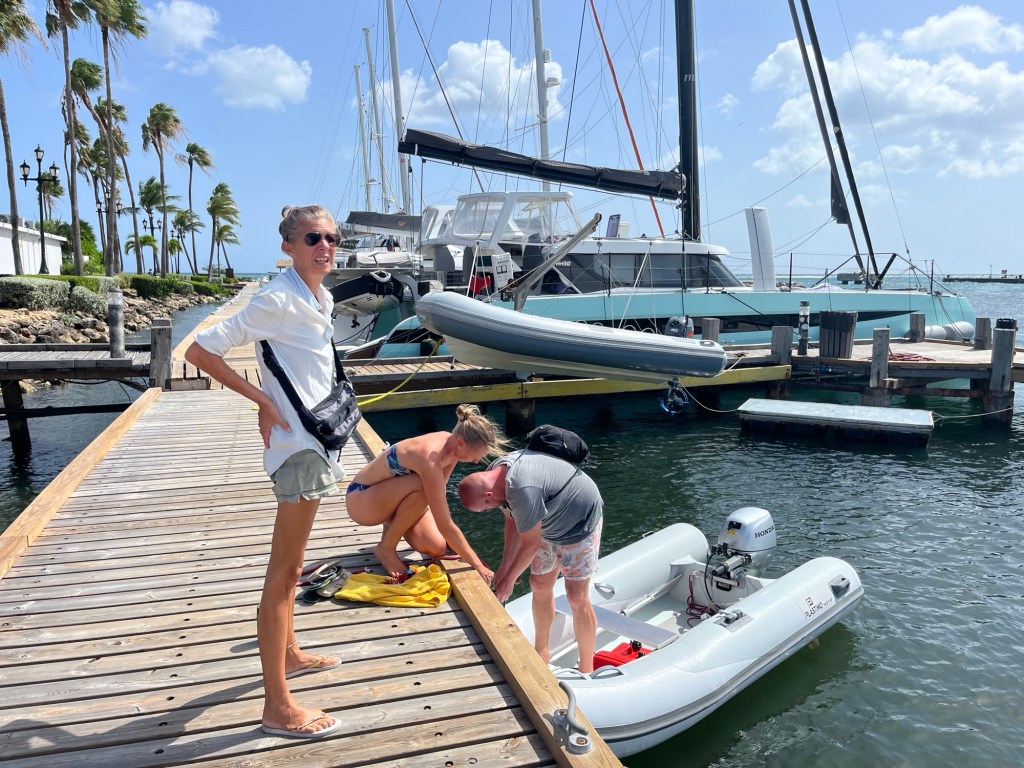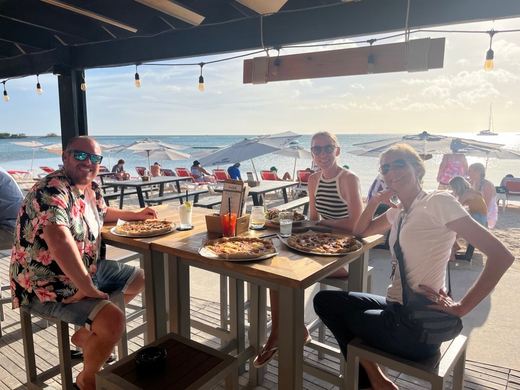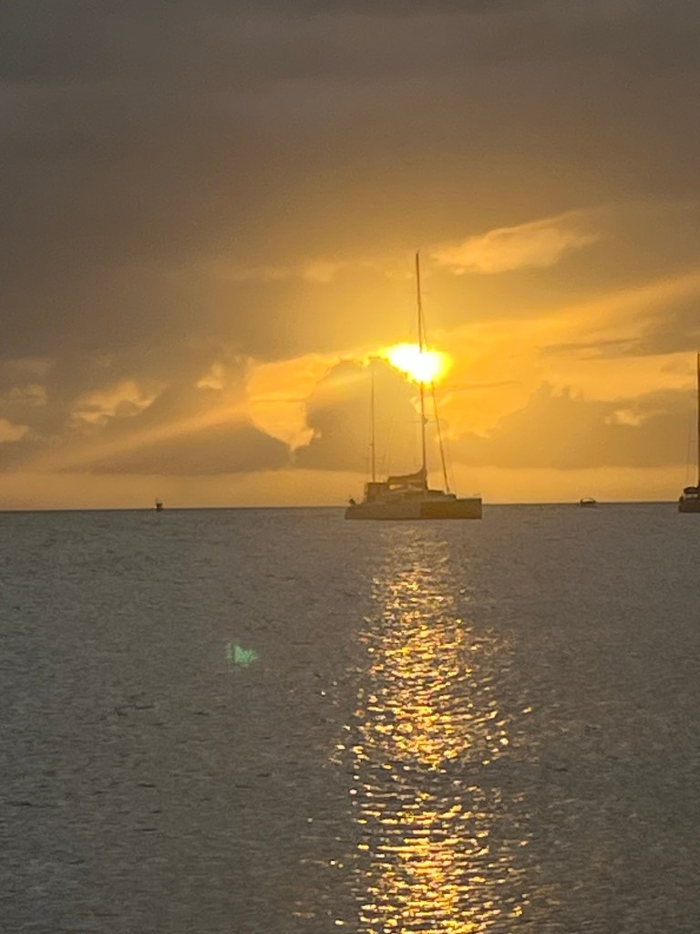 Da es nun nicht viel zu tun gab, genossen wir das Wiedersehen mit Sebastian und Verena von der „Waves“. Unser letztes Treffen auf Curacao war nun auch schon wieder mehrere Wochen her und es war immer ein schönes Vergnügen, bekannte Segler und Seglerinnen wieder zu sehen. Da es ein schöner Abend zu werden schien, holten uns beide mit ihrem wunderbar großen und mit laufendem Aussenborder ausgestattetem Dinghy ab und wir begaben uns an den Dinghysteg der nahgelegenen Pizzeria, die es den Yachties, von einem Restaurantbesuch unabhängig, gestatteten, eben diesen zu benutzen.