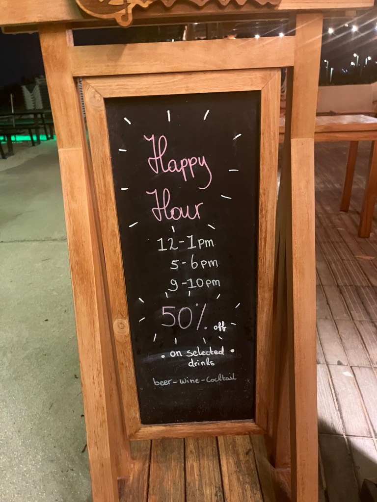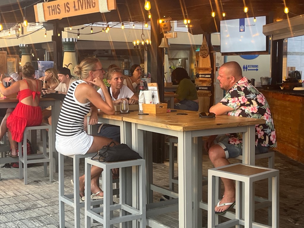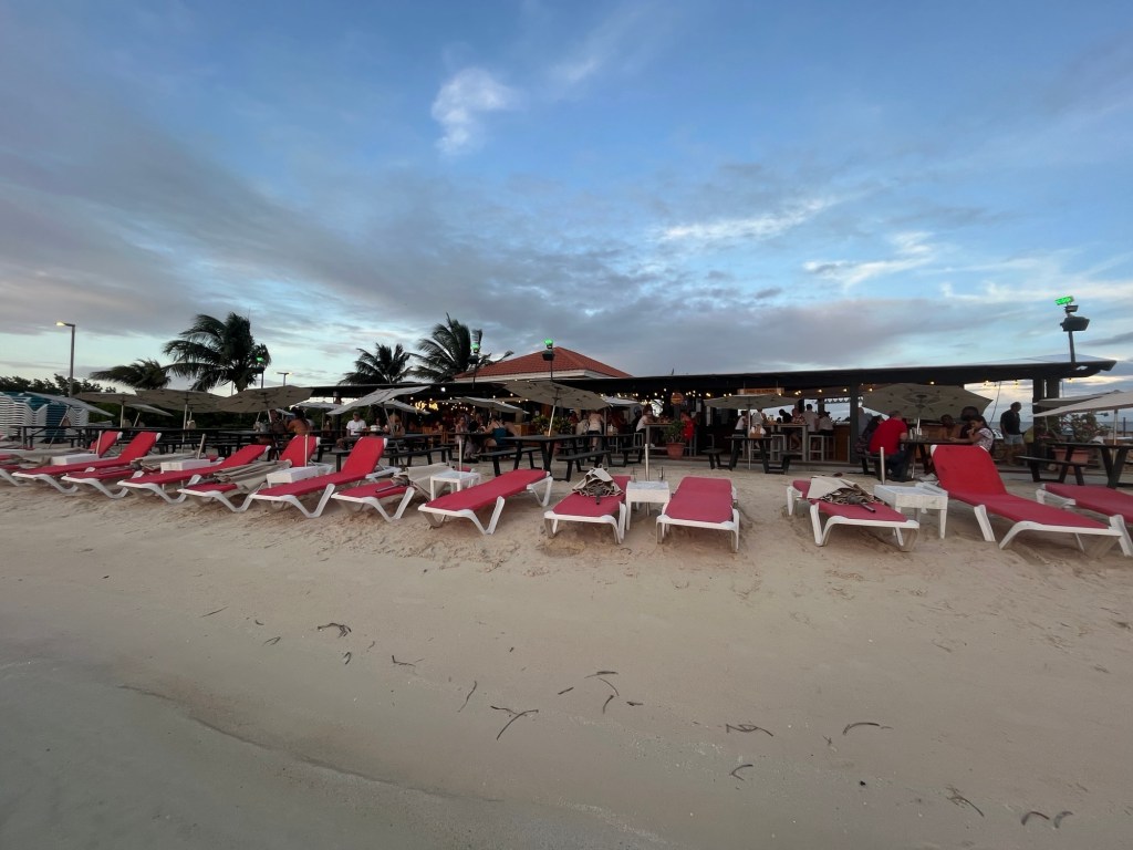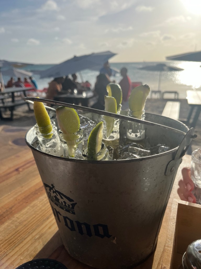 Die Strandbar des Surfer´s Beach war genau so wie man sich eine karibische Bar vorstellte. Wir fühlten uns fast wie im Urlaub (böse Zungen behaupten ja, wir wären schon die ganze Zeit im Urlaub), denn wir waren von gut gelaunten Menschen umringt, Hawaihemden, wohin man schaute. Chillige Musik dröhnte aus den Lautsprechern, hinter der Bar waren die Rasta´s und wirbelten die Flaschen rund um den Cocktailshaker. Auch wir starteten mit einem tropischen Cocktail, gut gemixt mit reichlich Alkohol, passend für die Happy Hour. Nach einer Pizza wollten wir keine kleinen Brötchen backen und so bestellten Sebastian und ich kurzerhand gleich ein Sechserpack auf Eis gekühlter Coronas, welche wir, ohne mit den Damen zu teilen, auch eines nach dem Anderem in unsere durstigen Kehlen gossen. Ein weitere Cocktail sowie ein Shot fanden den Weg zu uns bevor wir uns, schon etwas belustigt, wieder an Bord begaben. Dieser wunderschöne Abend mit unseren Freunden sollte nicht der letzte auf Aruba sein, doch keiner hallte bei uns Männern am nächsten Tag derart nach. Hangover!