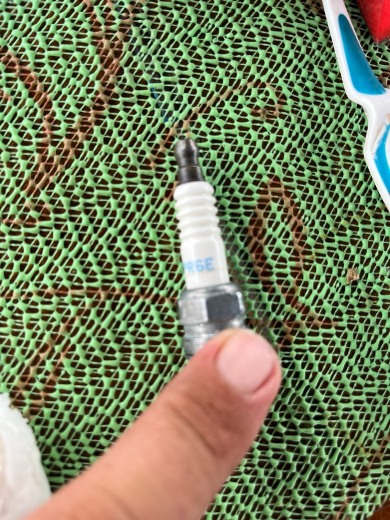 Obwohl am nächsten Morgen ein unstillbarer Durst die Kehle plagte und in der Gedächtnishalle die Meisterschaften im Hammerwerfen ausgetragen wurden, widmete ich mich dem Aussenbordmotor. Der Vergaser wurde zerlegt und gut mit Benzin durchgespült, Öl wurde sowohl im Motor als auch im Getriebe nachgefüllt und auch der Zündkerze wurde eine Begutachtung zuteil. Schließlich war der Jockel wieder zusammengebaut, neuer Benzin eingefüllt and mittels Nachhilfe durch eine Starthilfespray wieder zum leben erweckt. Wir waren so begeistert, dass der Patient wieder ansprang, dass wir den Motor sofort am Dinghy montierten. Testfahrten waren angesagt. Wieder sprang der Motor nach drei Zügen an der Startleine an und brabbelte so mehr oder weniger rund vor sich hin. Ein Kreis um das Boot folgte dem nächsten, immer größerer Runden um das Boot. Wie gesagt hörte sich der Motorlauf nicht so ganz richtig rund an, doch immerhin lief das Ding. Ich war überzeugt, dass es sich vielleicht um den einen oder anderen Tropfen Wasser vom Spülvorgang handelte, welcher diesen unrunden Lauf verursachte und begab mich deswegen auf einen längere Testfahrt. Mit nahezu Vollgas preschte (alle die unser Dinghy und unsern 3,5 PS Motor kennen, werden bei dieser Wortwahl in schallendes Gelächter ausbrechen) auf den Strand zu. Allzu lange „preschte“ ich nicht, denn aus dem unruhigen Lauf wurde ein Abgesang aus Spucken und Sprotzen, welcher in ein jähes Absterben des Motors mündete. Das wars dann auch. Obwohl ich gefühlt 100 mal in unterschiedlichen Konfigurationen (ohne Joker- ohne Gas, ohne Joker-mit Gas, mit Joker – ohne Gas, usw.) die Startleine zog, der Motor konnte sich nicht einmal zu einem Huster durchringen. Wie hieß es im Lied „Motorboot, Motorboot, rudern tu ich nur zur Not“, die „Not war gekommen und ich trat rudernd ( erfreulicherweise mit Rückenwind) den Rückweg zur Inspiration an. Tatsächlich hatte sich das Motoröl in eine milchige Brühe verwandelt, was auf Wasser im Schmierkreislauf schließen ließ. Doch das konnte nicht die Ursache dafür sein, dass der Motor nicht mehr startete. Wir vermuteten, dass mit der Zündkerze was nicht in Ordnung sein musste und bauten diese nochmals aus. Tatsächlich war diese enorm verkohlt. Es musste eine Neue her.