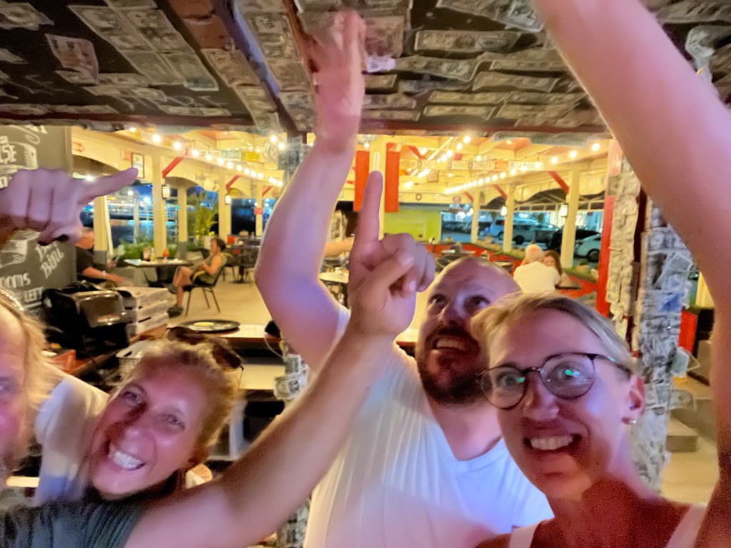Als uns der schon vertraute Bus wieder in der Marina ausspuckte, stellten wir fest, dass Kultur nicht nur durstig, sondern auch hungrig machte. In der Nähe der Marina war eine kultige Bar gelegen, in der leckere Burger serviert wurden. Diese Bar war ein Treffpunkt von Seglern und Weltenbummlern. Irgendwann hatte wohl einer dieser Exoten die Idee, einen „1 Dollar Schein“, versehen mit seinem Namen und dem seines Bootes , an die Decke zu nageln. Das schien Nachahmer gefunden zu haben und über Jahre und Jahrzehnte fand sich an den Decken und Wänden ein kleines Vermögen wieder. Dieser Tradition folgten wir natürlich. Ich zauberte einen Dollarnote aus meiner Tasche, Verena hielt schon die Feder bereit. Die Crews der Waves und er Inspiration signierten diesen und machten ihn mittels Tucke zum Teil dieser ungewöhnlichen Wanddekoration nach dem Motto „Inspiration was here“. Ein Abend voller lustiger Geschichten, schönen Momenten und einer geselligen Zeit neigte sich dem Ende zu. Natürlich zogen wir noch in einen weitere Bar, um einen Absacker zu schlürfen. Tatsächlich sollte der Jägermeister mit Erinnerungen an die ferne Heimat auch in der Karibik wohlschmeckend die Kehle hinuntergleiten. Ob wir zum Boot zurück wankten oder ob einfach die die Insel im Gang der See schwankte, vermag ich nicht mehr zu sagen. Zurück im Cockpit der Inspiration sanken wir jedenfalls bald in den wohlverdienten Schlaf.