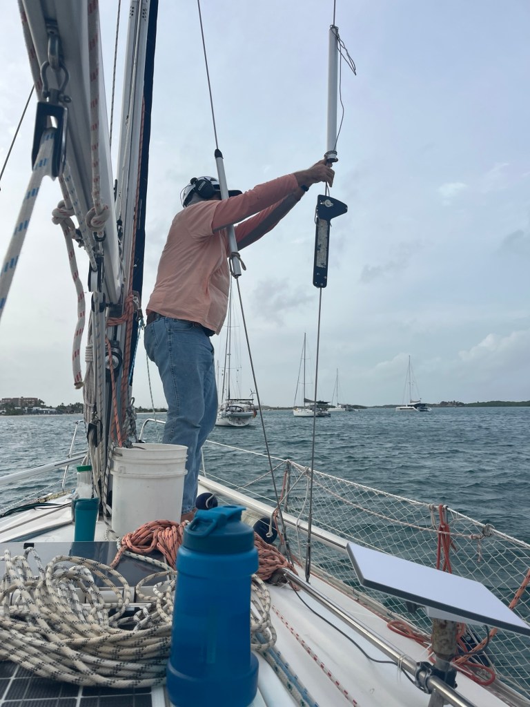 Des weiteren lernten wir Betza und Sander kennen, das Riggerteam von Aruba schlechthin. Sander ist der schon etwas ergraute Guru und Betza ist ihres Zeichens die Frau für die Arbeit im Mast. Trotz nicht optimalen Wetters kamen sie sofort zu uns an Bord um sich unserem Rigg anzunehmen. Sander wies mich darauf hin, dass die vermeintlich mittels der Zollstockmethode korrekt gespannten Wanten statt der angepeilten Spannung von 23 % der Bruchlast lediglich eine Spannung von 12 % Bruchlast aufwiesen. Kein Wunder das diese lose kamen. Soviel zur Spannung der Wanten mit der Zollstockmethode. Wir werden uns ein Messgerät für die Wantenspannung besorgen. Das kostet zwar 400 Dollar, doch damit könne, zumindest wir die Wanten ausreichend einstellen.